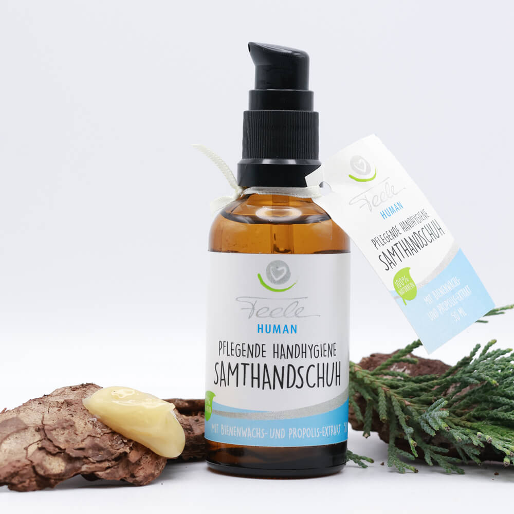 Our 2-in-1 hand hygiene “Samthandschuh” offers efficient and skin friendly hand hygiene for at home or on the go. Beeswax and propolis extracts nourish and protect the skin from drying out.