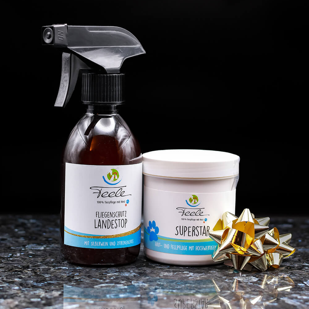 Dieses Set kombiniert effektiven Schutz mit wohltuender Pflege für Pferd und Hund. Der „Landestop“ bietet zuverlässigen Schutz vor Fliegen, insbesondere der Hirschlausfliege, und bleibt dank seiner pflanzlichen Rezeptur selbst bei Schweiß oder einem kurzen Bad haften. Auch auf Textilien anwendbar – ideal, um Pferd, Hund und Mensch unterwegs zu schützen.